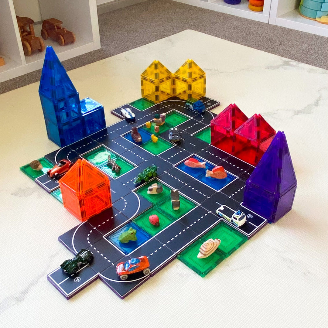 Our 40 piece pack allows you to create roads by adding our tile toppers to your existing magnetic tiles. With a variety of road pieces, intersections, curves, and more, your child can create unique transportation routes for their toy cars, enhancing imaginative play.