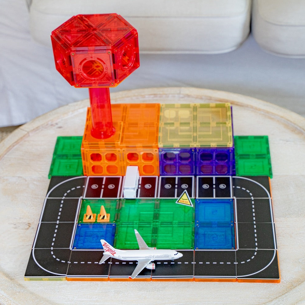 Ons 40-delige pakket stelt u in staat om wegen te creëren door onze tegeltoppers toe te voegen aan uw bestaande magnetische tegels. Met een verscheidenheid aan wegstukken, kruispunten, bochten en meer, kan uw kind unieke transportroutes creëren voor hun speelgoedauto's, waardoor het fantasierijke spel wordt verbeterd.